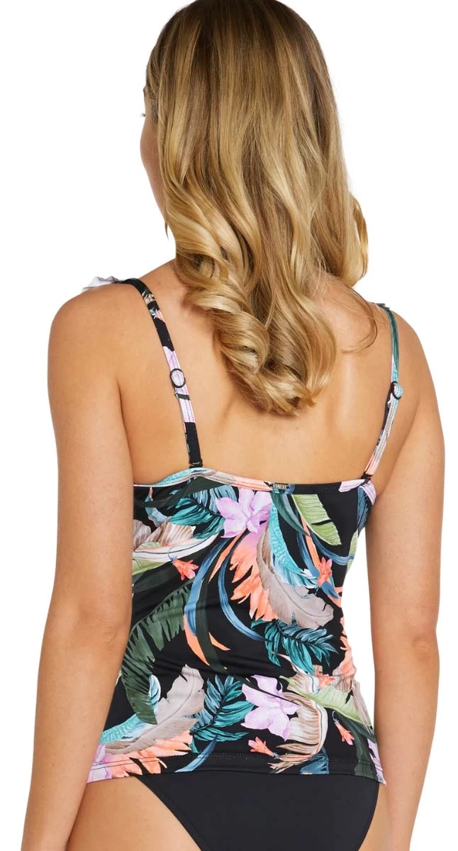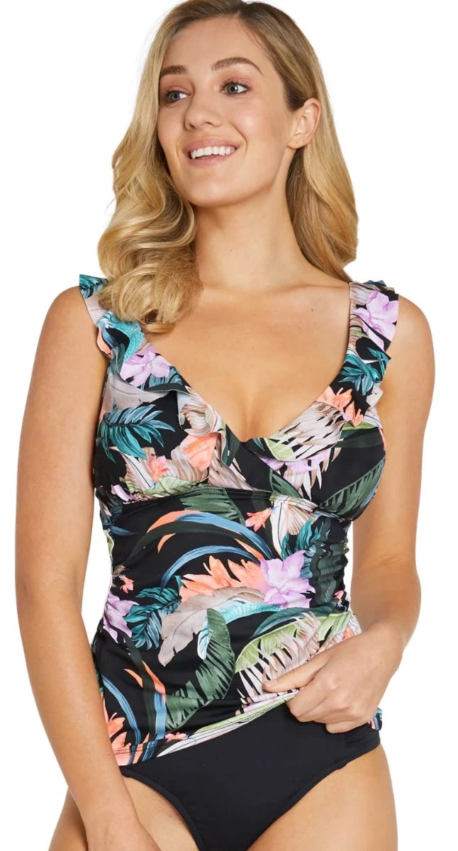 Welcome to Borneo, enjoy the lush tropical print and dream of exotic places! The D-DD/E cup tankini singlet features flattering cross V neckline with feminine frill detail, removable moulding, hidden underwire to lift the bust, adjustable and convertible straps.