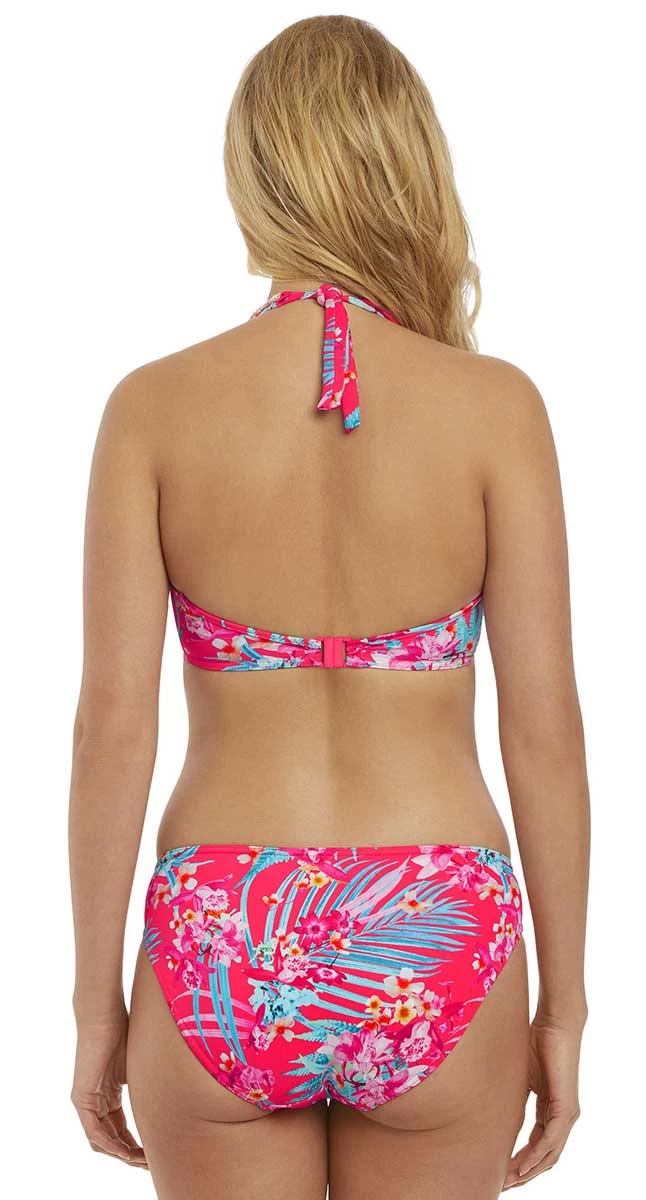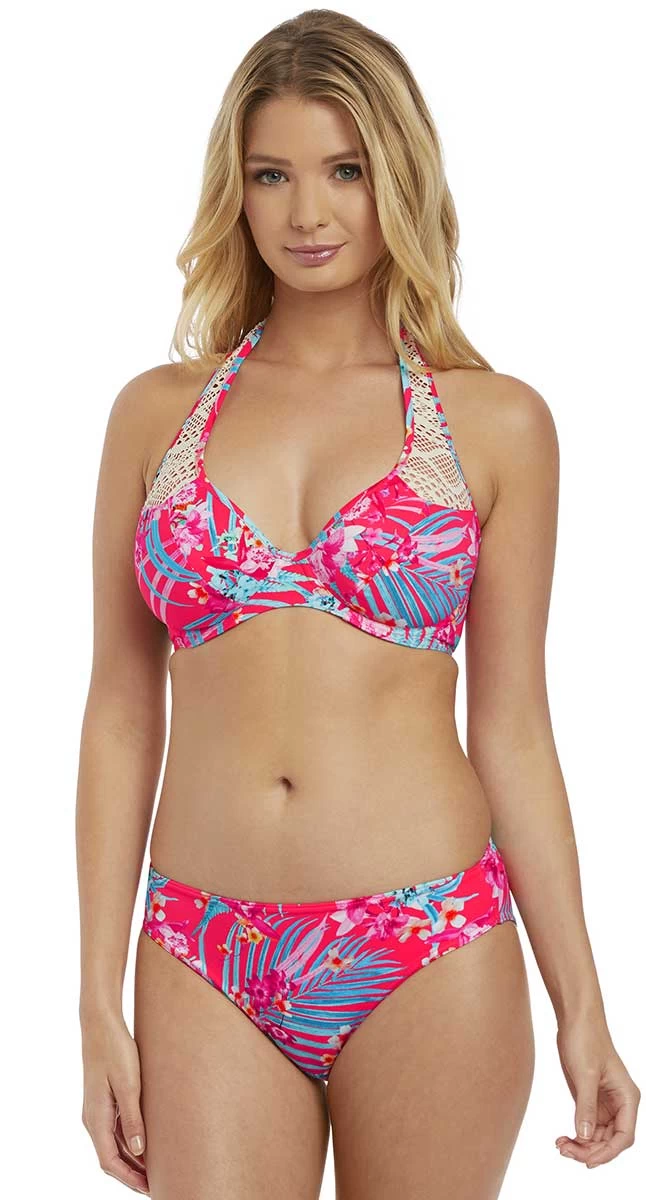 Embrace the Wild Sun! This E-F cup fitting bikini top features underwire to lift and support the bust, halter neck tie and secure back clip, cute crochet detail.