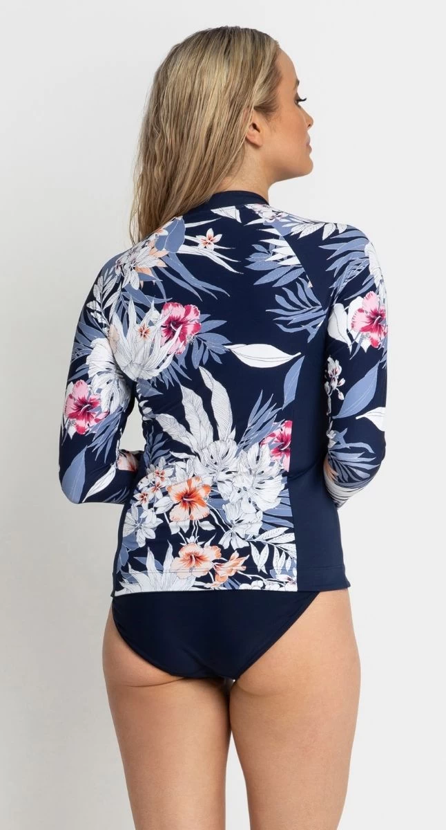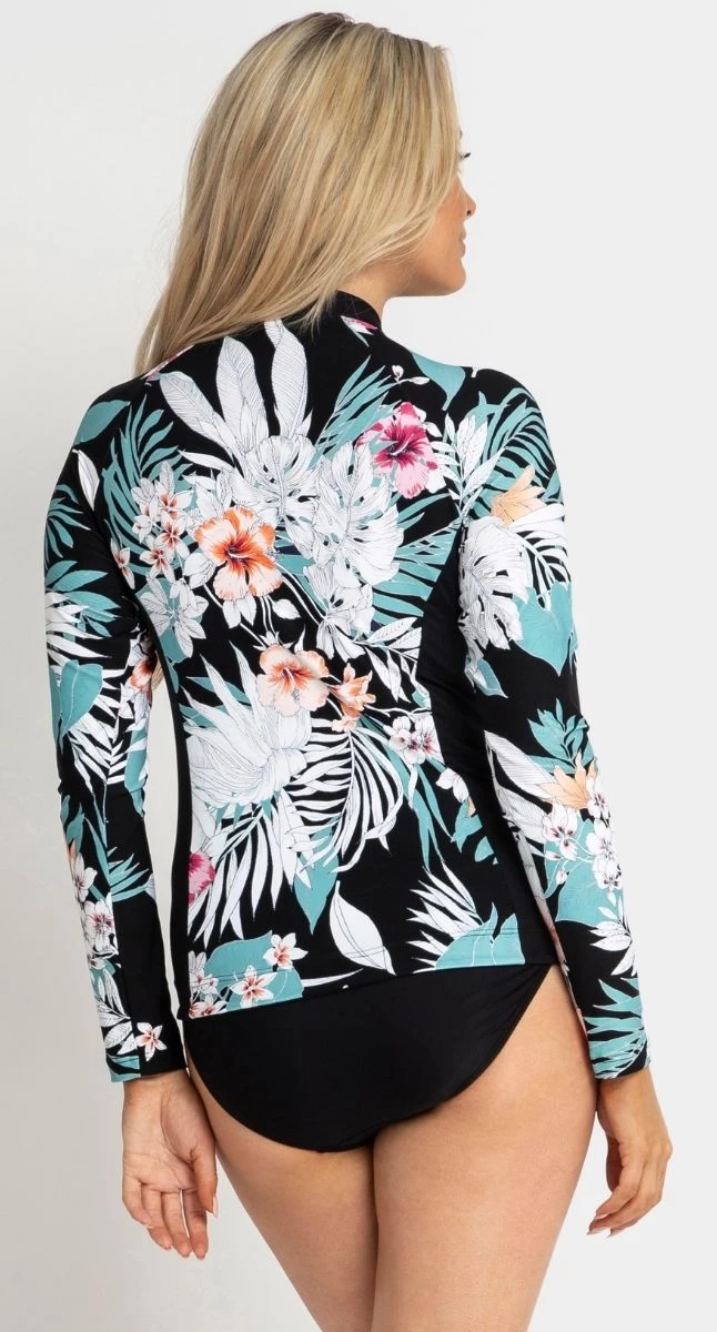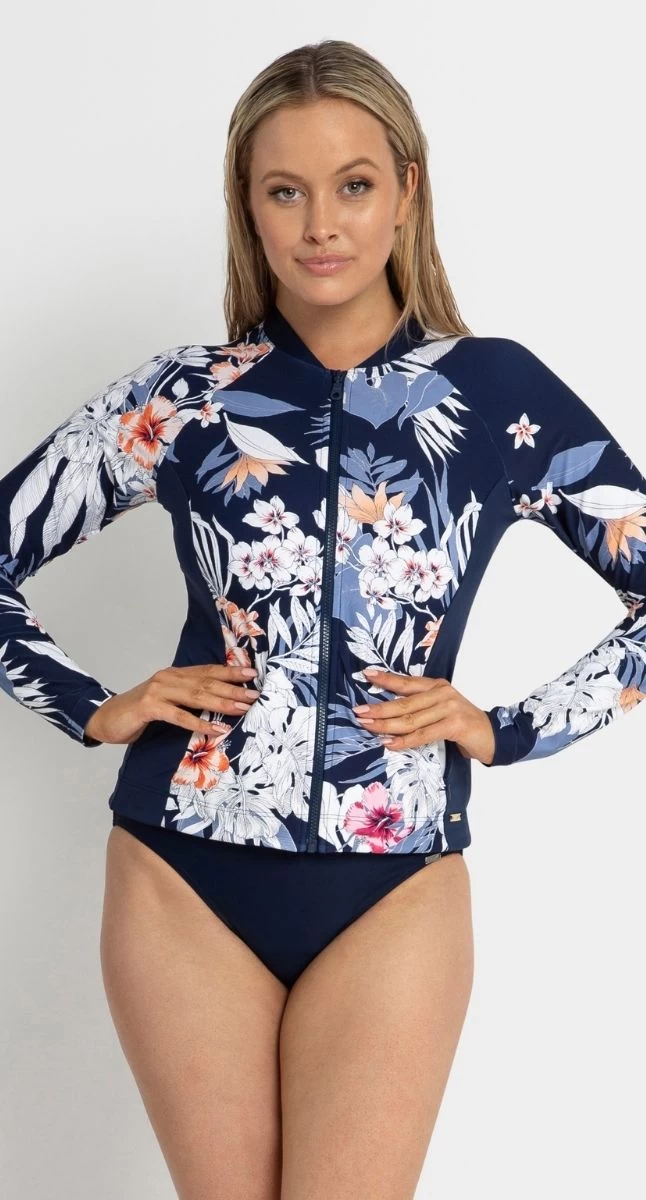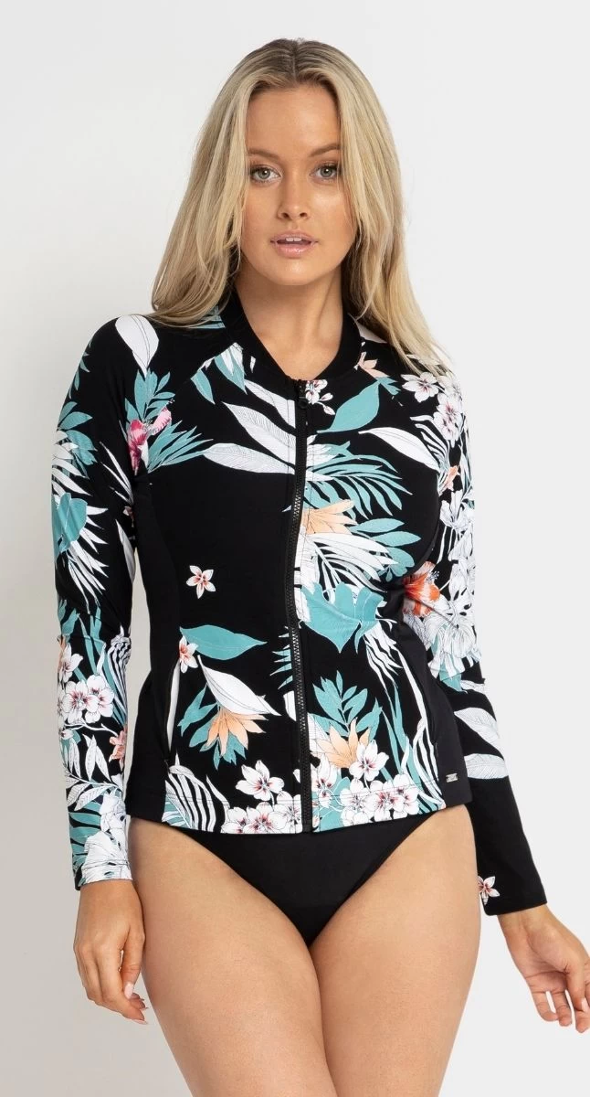 This amazing active zip front rash top has so many uses! Think water activities, SUP – snorkeling, surfing etc plus great sun & wind protection for beach walking and keeping active “Swim & Gym”! Super handy side zip pockets, UPF 50+ sun rating, flattering black contrast panel for a slim look thru the torso.