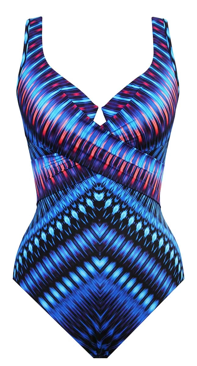 Feel fabulous in the new Marrakech Escape body sculpting one piece. Featuring super firm fabric to have you looking and feeling 10 pounds lighter, moulded underwire cups to shape and support the bust, slimming print placement to keep the eye moving over the torso, wider straps that stay put.