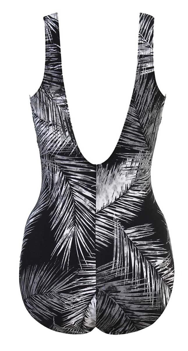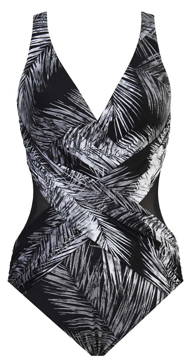 Look and feel 10 pounds lighter in the beautiful palm leaf body shaping one piece. Featuring moulded cups to shape the bust, wide straps that stay in place,flattering cross over design with gathering to slim and streamline the torso, super firm slimming fabrication.