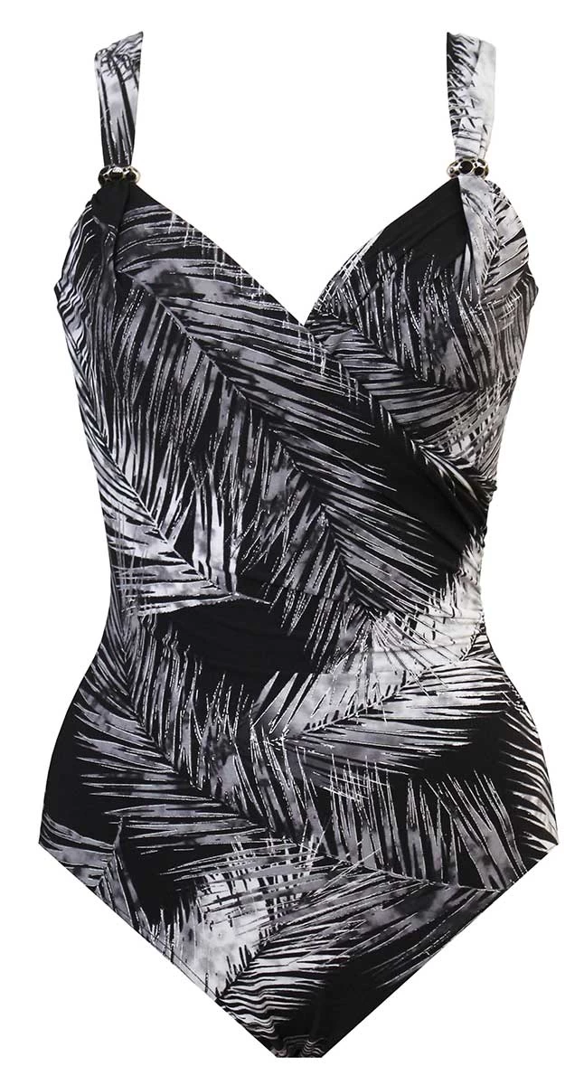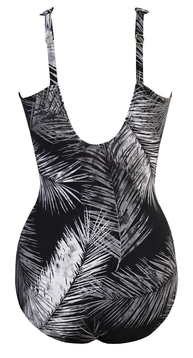 Funky palm leaf print body sculpting swimsuit! If you are looking for a miracle, these slimming one pieces will have you looking and feeling 10 pounds lighter. Featuring underwire to support and lift the bust, moulded cups for shape, flattering cross over design to nip the waist in and slim the torso. Adjustable straps and smoothing mid scoop back.