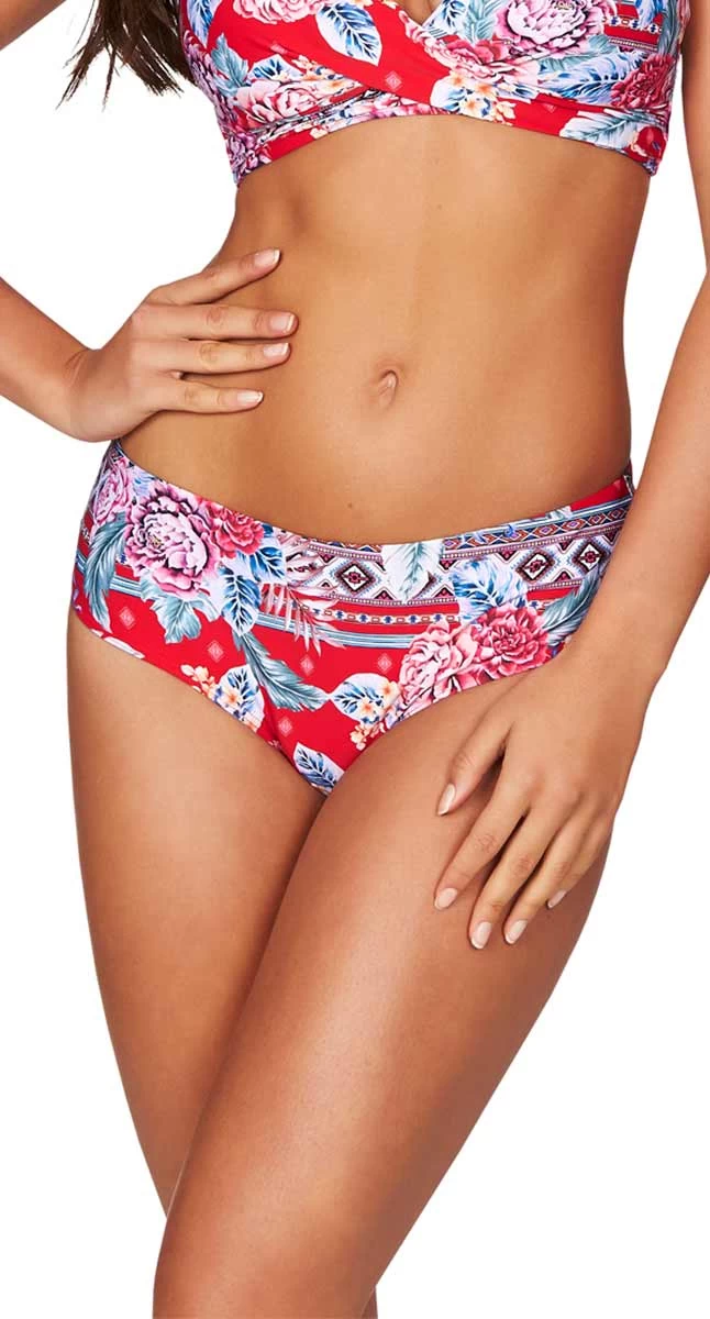 The Aztec Rose mid rise bikini pant offers medium coverage across the bottom and hip, featuring powermesh lining support front and back.
