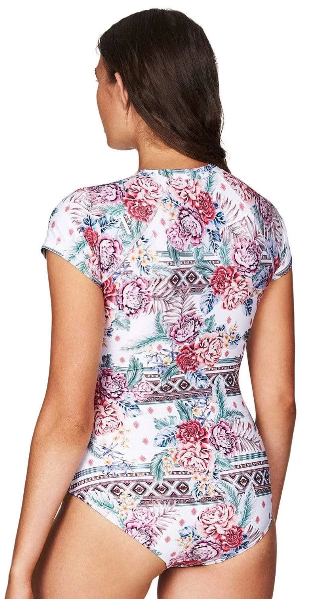 Sporty & flirty all in one! Have fun in the sun wearing the feminine Aztec Rose short sleeve suft suit, featuring UPF 50+sun protection, shelf bra with soft cups, body sculpting powermesh support to slim the tummy, multifit from a B Cup to DD cup.