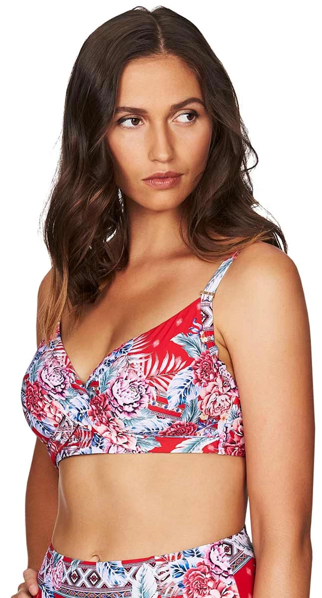 Feel supported and stylish in the Aztec Rose DD/E cup bikini top, featuring hidden underwires to lift the bust, adjustable and convertible straps for a customised fit, adjustable back slider + secure clasp, side boning to keep the bust forward and powermesh lining for added support.