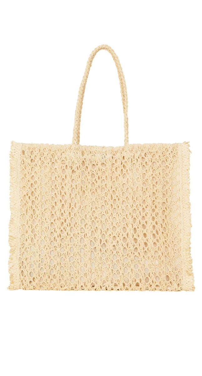 Seafolly carried away paper crochet bag. 100% paper, lined inside, side pocket, dimensions 35cm x 40 cm. Can be used as a beach bag, shopping bag will pack flat on the bottom of your suitcase for holidays in the sun.