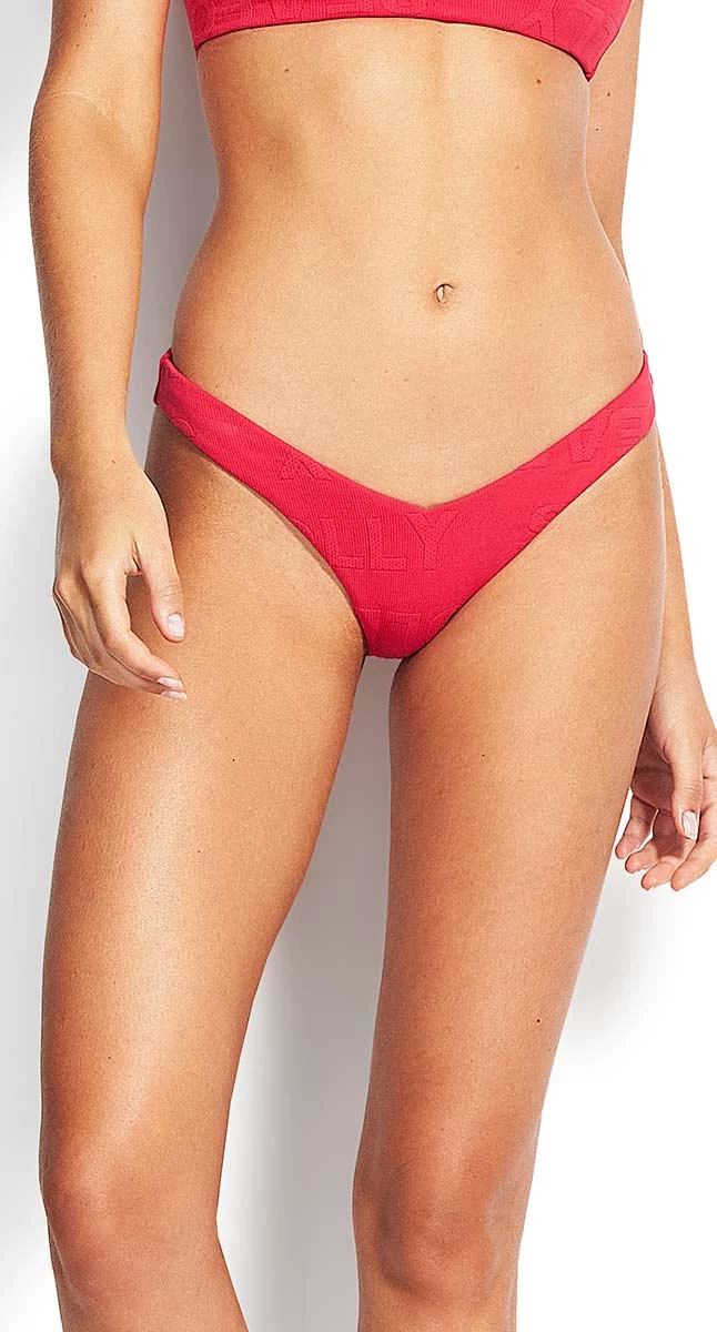 Seafolly Your type V high cut Rio pant-Rio cut gives you a scoop bottom, high cut on the leg line gives the look of elongating the leg line, The V shape lengthens the torso. This pant is what you think of when the 80`s bikini is mentioned. Seamless edge Jacquard fabric with Seafolly logo.
