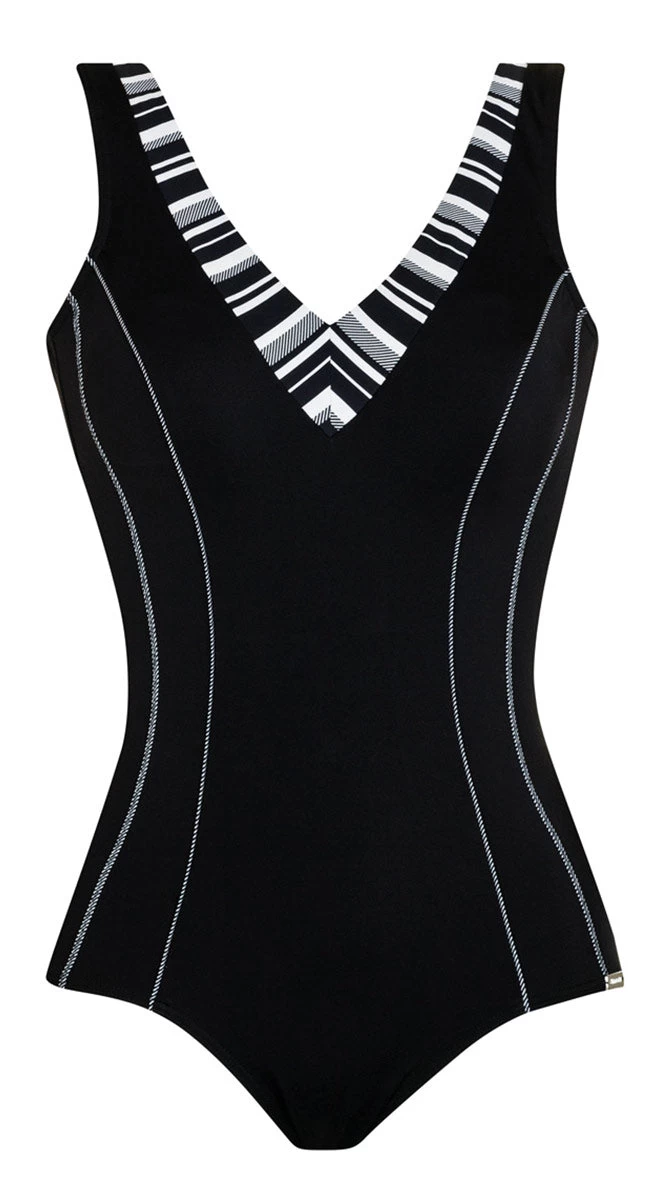 Quick dry one piece with light tummy control power mesh to slim the torso. Flattering V neckline with contrast detail, fixed soft molded cups to shape and support the bust, wider comfortable straps that stay in place.