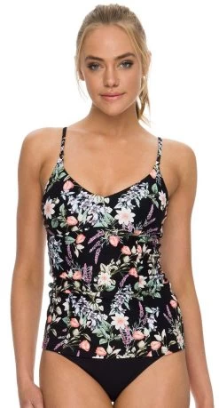 | Hand painted florals inspire the delicate new Florantine collection. This bralette style tankini is best for A-C cup fittings, featuring removable soft moulded cups and adjustable shoulder straps. Team back with the matching pant – also looks great back with black! |