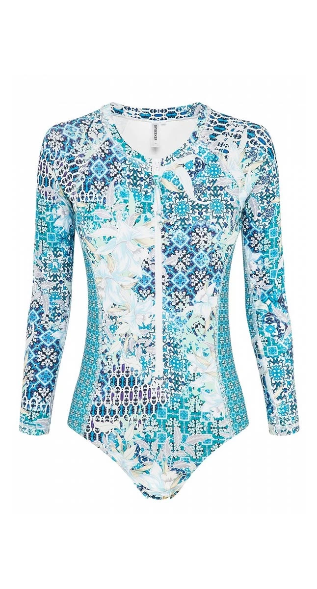 Fall in love with the geo tropical mix that is Fresco! The sporty surfrider one piece features built in shelf bra with soft cups, smooth plastic centre zip, excellent UV protection, generous body length, contour panels to visually trim the waistline. Sup anyone?