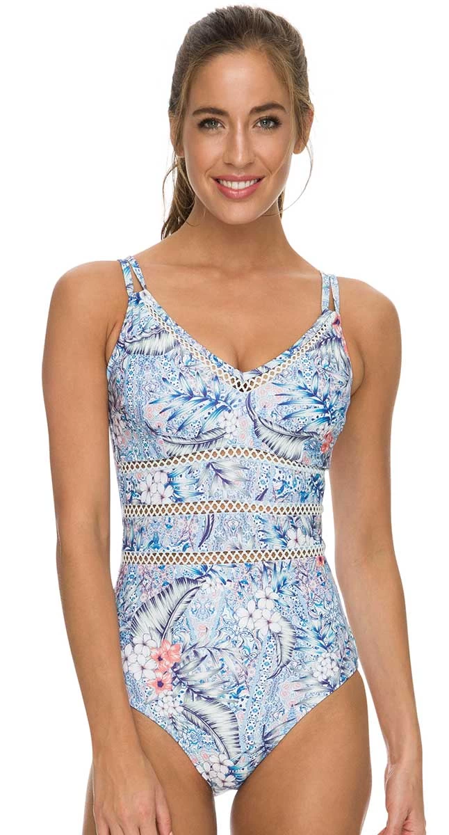 The Javanese minimiser bralette one piece is perfect for DD-E cup ladies looking for a supportive + flattering swimsuit. Features underwires, adjustable twin shoulder straps and clever placement lace detail to nip the waist in.